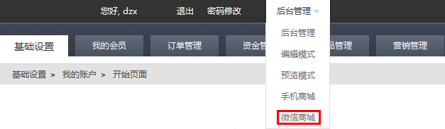 第1步:如果您已經(jīng)是微信商城用戶(hù),需登陸B(tài)2C商城后臺(tái)管理系統(tǒng),將鼠標(biāo)移至模式切換處,在彈出的下拉列表中點(diǎn)擊【微信商城】按鈕。