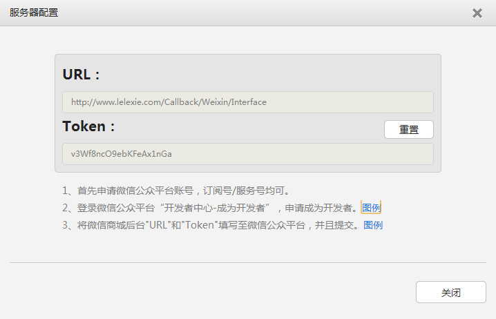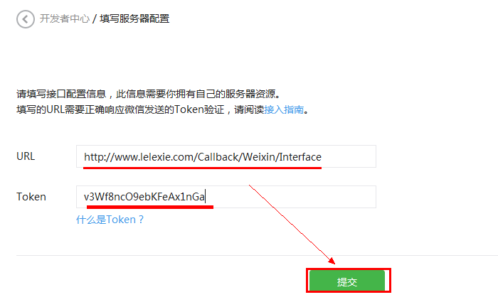 第3步:接下來(lái)登錄微信公眾平臺(tái),點(diǎn)擊【開(kāi)發(fā)者中心】按鈕,點(diǎn)擊【修改配置】,然后返回微信商城后臺(tái)將【URL】和【Token】信息復(fù)制到微信公眾平臺(tái)對(duì)應(yīng)的輸入框,點(diǎn)擊【提交】按鈕即可完成綁定。